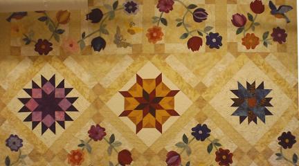 This page also includes art quilts donated to various charity auctions in western Montana, benefitting the Daly Mansion, Teller Wildlife Refuge, and Safe Harbor. The title photo is of the finishing stages of machine quilting on the "Daly Mansion" quilt, a group project of the Bent Needlers, a mini-group of the Bitterroot Quilters Guild specializing in applique work.