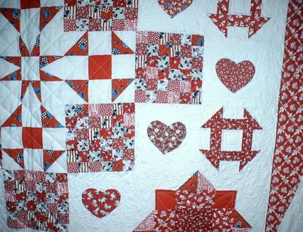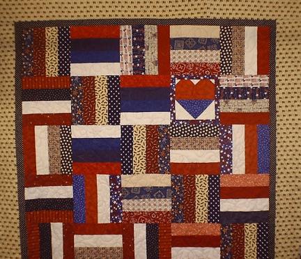A lap quilt, "Quilts from the Heart," made by the Bent Needlers to support families of soldiers in Iraq.