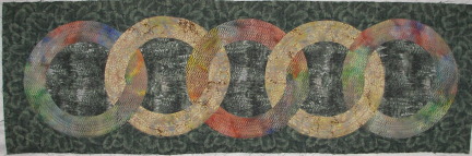 An appliqued table runner, "Rainforest Rings" pattern.