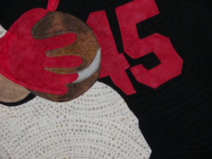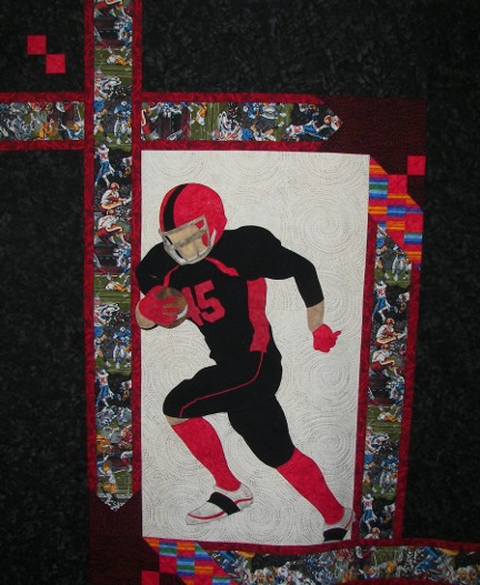 Detail of the quilting on the background and appliqued figure in the football quilt above.