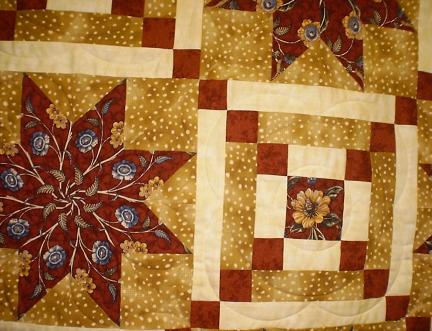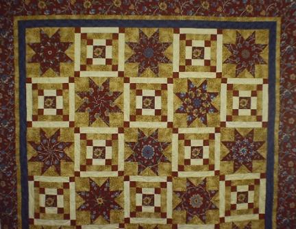 A full size quilt, stack 'n whack stars with Irish Chain and fussy-cut flowers. Quilted with interlocking arcs and circles.