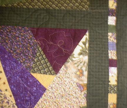 Detail of the above quilt, with pansy quilting pattern in variegated thread. The leaves and vines in the sashing are done in matching thread color