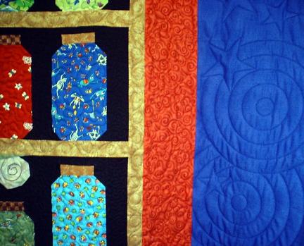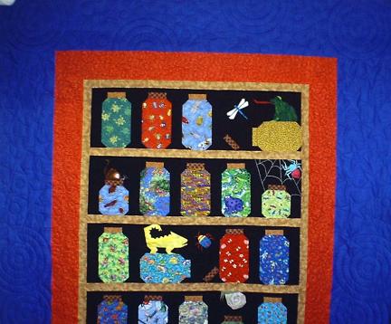 A twin-sized Bug Jar quilt, quilted with concentric circles and stars in the border, a looping meander in the sashing, and bug and frog figures.