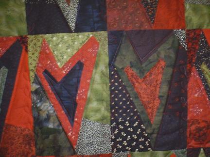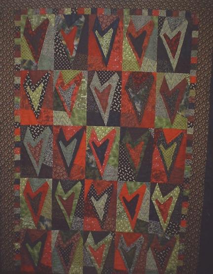 A lap quilt from the Buggy Barn Hearts pattern. This is quilted with feathers across the block boundaries and straight lines following the heart pieces.