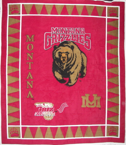 A stadium blanket, quilted as a whole-cloth quilt on a printed logo panel.