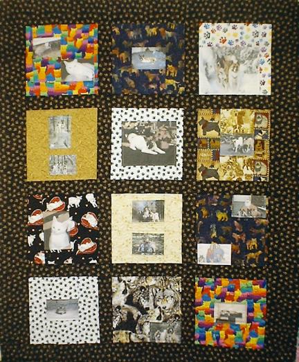 A photo quilt wall, with pet photos, quilted with outlining around the photo elements and a pawprint pattern in the sashing.
