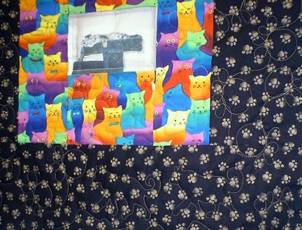 Detail of the lower right corner of the pet photo quilt, showing dog figures quilted in the border.