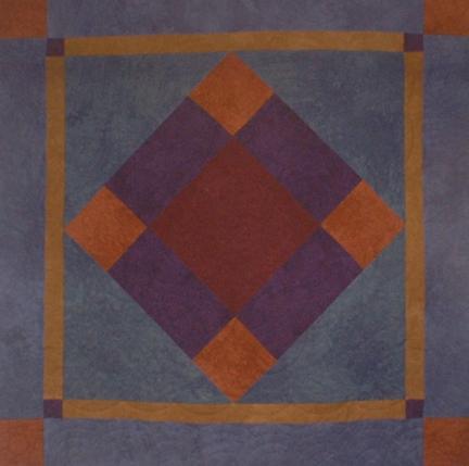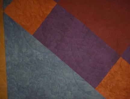 An Amish-style wall hanging. Quilted with traditional Amish quilting motifs: feather bows in the corners, cables in the dark blue pieces, a double feather wreath in the center, arcs in the inner border, and baptist fans in the border.