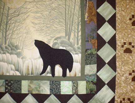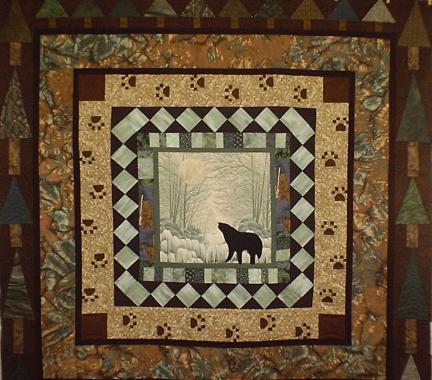 A panel wall hanging, with an appliqued wolf silhouetted against a winter scene, wolf paw prints in the middle border, and pine trees pieced in the outer border. Quilted with matching-color thread outlining the elements in the background, tight stippling on the wolf, leaves and vines in the inner border, diamond arcs in the on-point squares, arcs in the background of the paw prints, and a zig-zag suggesting branches in the pine trees.