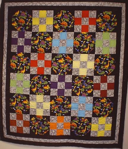 A child's lap quilt, nine-patch with dinosaur fabric in the alternate blocks. Quilted with "ABC" writing and the child's name in the inner border and hearts in the outer border. The dinosaur print is outlined, with arcs in the nine-patch squares.