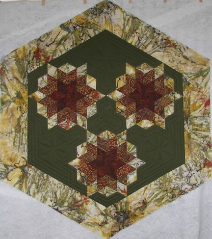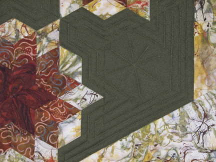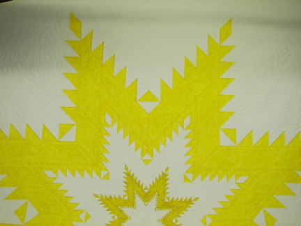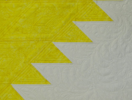 A partial view of a king-sized feathered star quilt, Quilted with feathers in the background, outlining spirals in the triangle points, and diamonds and stippling in the star points.
