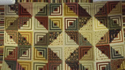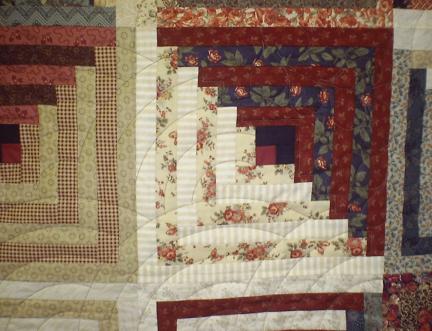 Detail of the Civil War Log Cabin, showing the piecing and quilting near the center of the quilt.