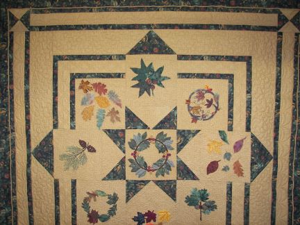 A block exchange quilt, with the appliqued leaf blocks each stitched by a different member of the group. Quilted with feathers, stippling, swags, grids, and outlining.