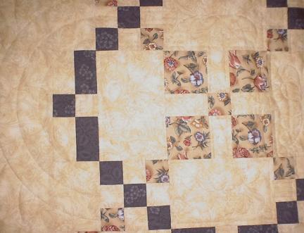 Closeup of one of the Burgoyne Surrounded blocks, showing the concentric circles outside the block and four feather bows around the block center.