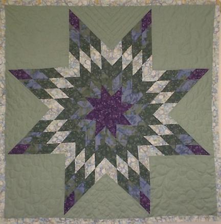 A lone star wall hanging. Quilted with feather wreaths and bows in the background, and quarter-inch outlining and feathers in the star.