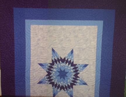 A lone star quilt in queen size. The background was quilted with baptist fans to suggest clouds. The star is quilted with quarter-inch technique. Composite photo.