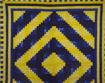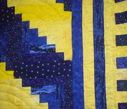 Log Cabin quilt in barn raising layout. Quilted with concentric arcs in the yellow bands, loops and stars in the borders, and feathers in the blue bands Composite photo.