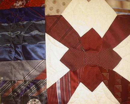 Detail of the necktie quilt, showing the bow tie squares and quilting technique.