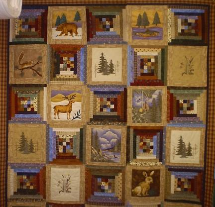 A picture-panel quilt, one of many quilted in the past year. This one is the largest, a queen-sized quilt, with 16-patch centers in log cabin for the alternating blocks. The owner specified "no stippling" for this one, so the picture panels have mostly outlining, with minimal background quilting. Composite photo, taken in our studio.