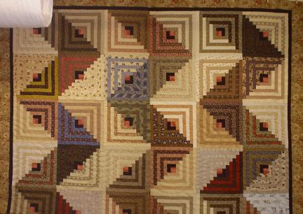 A queen-sized Civil War Era-inspired quilt. Quilted with baptist fans in the lighter areas and feather garlands in the darker areas. Composite photo, taken in our studio.