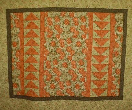 This quilt has stitching outlining the printed flowers in the center, and free-hand leaves and flowers in the border and through the flying geese strips.