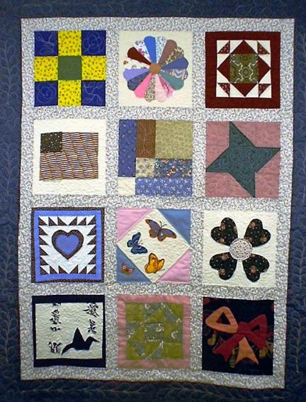 Overall group-pieced sampler project. Each square is quilted in a pattern that fits the piecing. The borders and sashing have free-hand feathers and hearts to tie the blocks together.