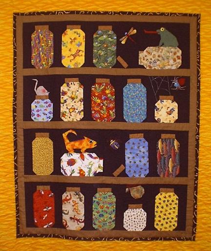 "Bug Jars" is a popular children's quilt. This one is lots of fun, with many different bugs, snakes, and fish in the jars. This quilt was made by a teen-ager, who added the pieced animals to the design. Some of the bugs have escaped and are hiding in the quilting...