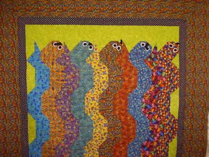 Someone's grandson will have fun with this snake quilt. The main quilting theme is a meandering stitch, with messages hidden in the sashing.