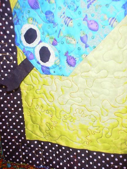 Detail of the above quilt: two frogs hide in the corner from this snake in the grass.