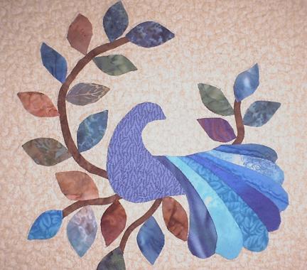 Detail of the appliqued wall hanging, showing feather quilting and outlining in the peacock applique.