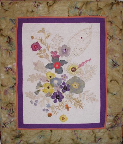 "Garden Thyme,", a wall hanging, pounded fresh flowers on prepared fabric, machine quilted and embellished with beads.