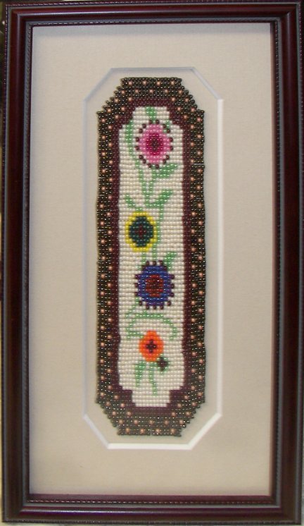 A piece of traditional loomwork beading, mounted and framed for display. Approximately 5-3/8" by 10-3/4" overall (13.2 x 26.5 cm).