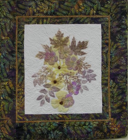 A pounded-flower wall hanging, with fall leaves.