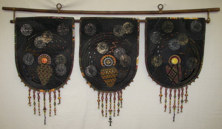 "Three Muses," a triptych of three goddess figures; quilted fabric with beads and acrylic paint.
