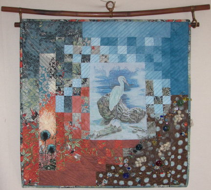A quilted wall hanging, 20 inches square, with gel-transfer crane image, beads, and netting.