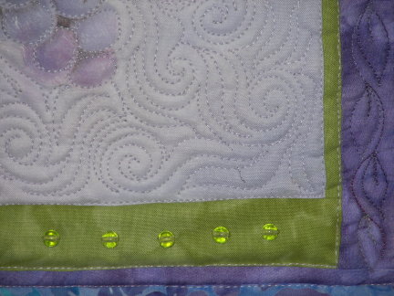 A quilted wall hanging, 18 inches square, with gel-transfer images of grapes, embellished with beads in the border.