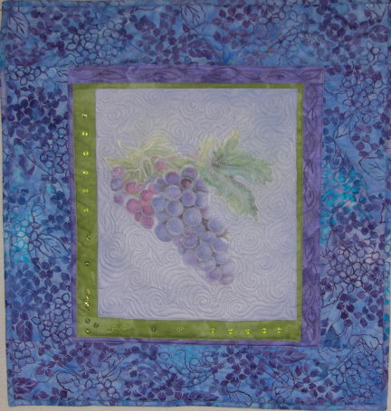 A quilted wall hanging, 18 inches square, with gel-transfer images of grapes, embellished with beads in the border.