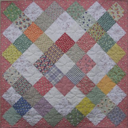 An original baby quilt, based on a charm pack of Aunt Gracie's fabrics. Pieced by Larye for a new great-granddaughter.
