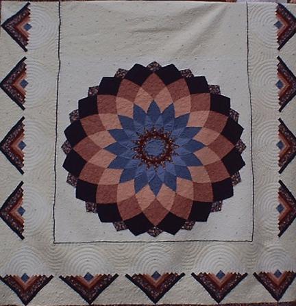 I made this quilt for my sister about eight years ago for her guest room, and tied it. This year, I took it apart and quilted it on the long-arm machine. The dahlia pattern is from The Quick and Easy Giant Dahlia Quilt on the Sewing Machine, by Susan Alysworth Murwin and Suzzy Chalfant Payne. I added the log cabin borders.