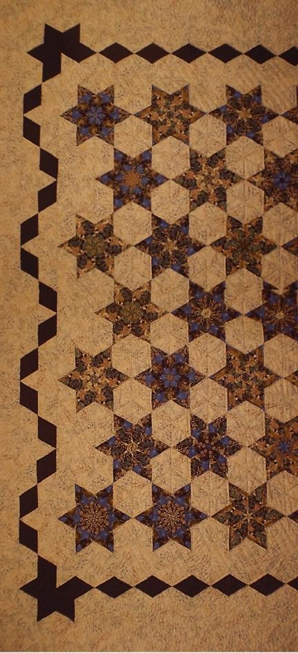 Stack 'n Whack queen size quilt. Quilted with quarter-inch technique in the black border and stars. A diagonal grid was used around the outside of stars that have concentric center circles.