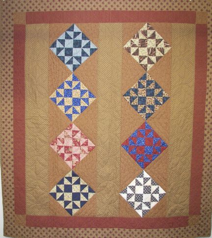 "Block 7 Strippy 2x4," a quilt designed and assembled by Larye from the April 2007 Moda University postcard block drawing. Each of the eight nine-patch blocks was made by a different class member.