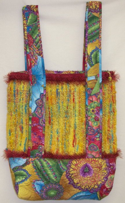 A quilted handbag with hand-woven panel.