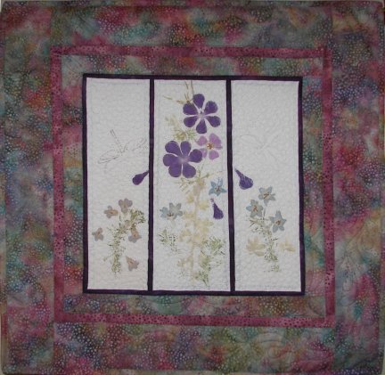 "Three Part Harmony," a small tryptych panel quilted wall hanging, hand-dyed with natural flowers, fabric paint, and beads.