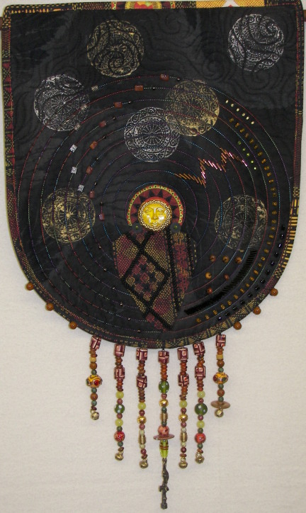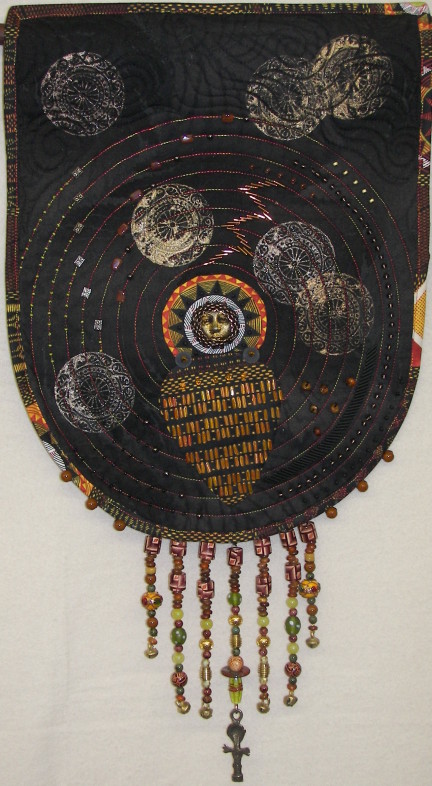 "Three Muses," a triptych of three goddess figures; quilted fabric with beads and acrylic paint.